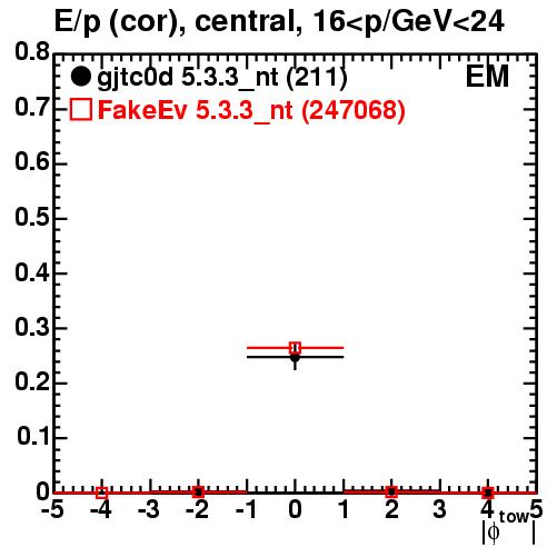 E/p vs. relative tower phi | central (tower 1-4) | track momentum bin 16-24 GeV/c