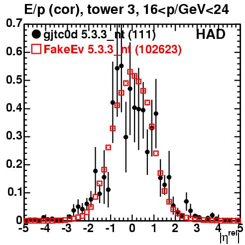 | E/p vs. relative eta | tower 3 | track momentum bin 16-24 GeV/c | ||||||