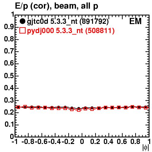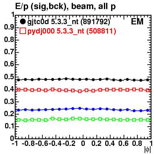 | E/p vs. relative phi (target tower) | beam (tower 17-20) | track momentum bin all GeV/c | ||||||