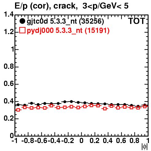 | E/p vs. relative phi (target tower) | crack (tower 10-11) | track momentum bin 3-5 GeV/c | ||||||