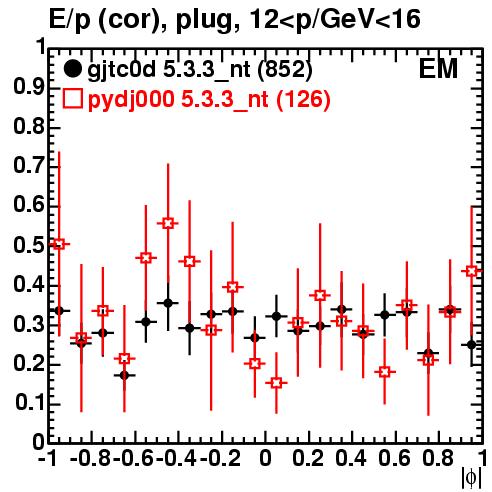 | E/p vs. relative phi (target tower) | plug (tower 13-15) | track momentum bin 12-16 GeV/c | ||||||