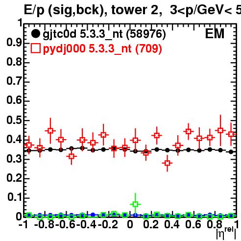 | E/p vs. relative eta (target tower) | tower 2 | track momentum bin 3-5 GeV/c | ||||||