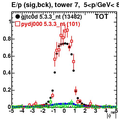 | E/p vs. relative phi | tower 7 | track momentum bin 5-8 GeV/c | ||||||