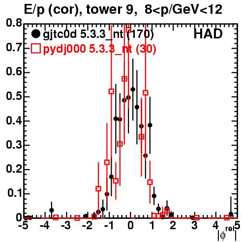 | E/p vs. relative phi | tower 9 | track momentum bin 8-12 GeV/c | ||||||
