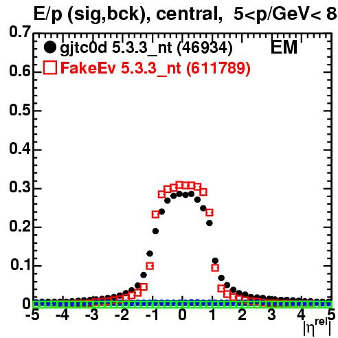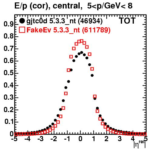 | E/p vs. relative eta | central (tower 1-4) | track momentum bin 5-8 GeV/c | ||||||