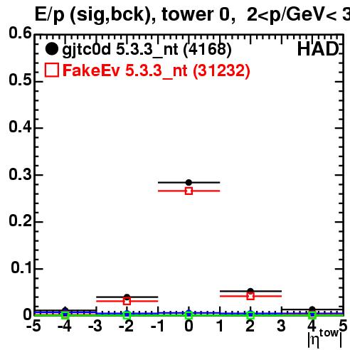 E/p vs. relative tower eta | tower 0 | track momentum bin 2-3 GeV/c
