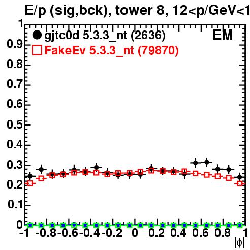 | E/p vs. relative phi (target tower) | tower 8 | track momentum bin 12-16 GeV/c | ||||||