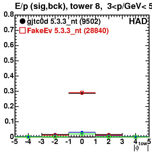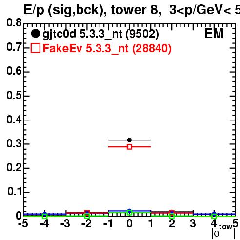 | E/p vs. relative tower phi | tower 8 | track momentum bin 3-5 GeV/c | ||||||