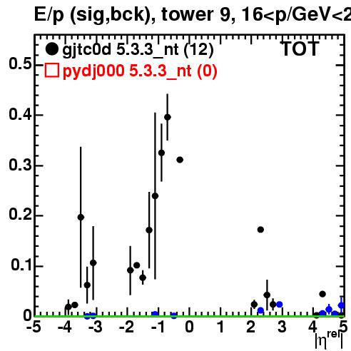 | E/p vs. relative eta | tower 9 | track momentum bin 16-24 GeV/c | ||||||
